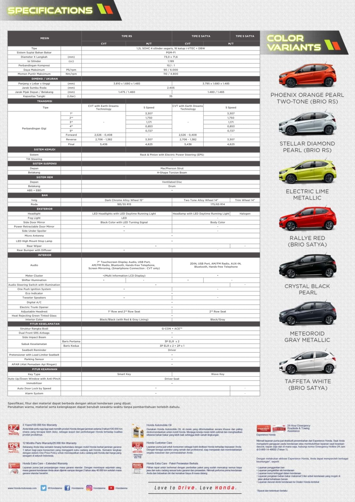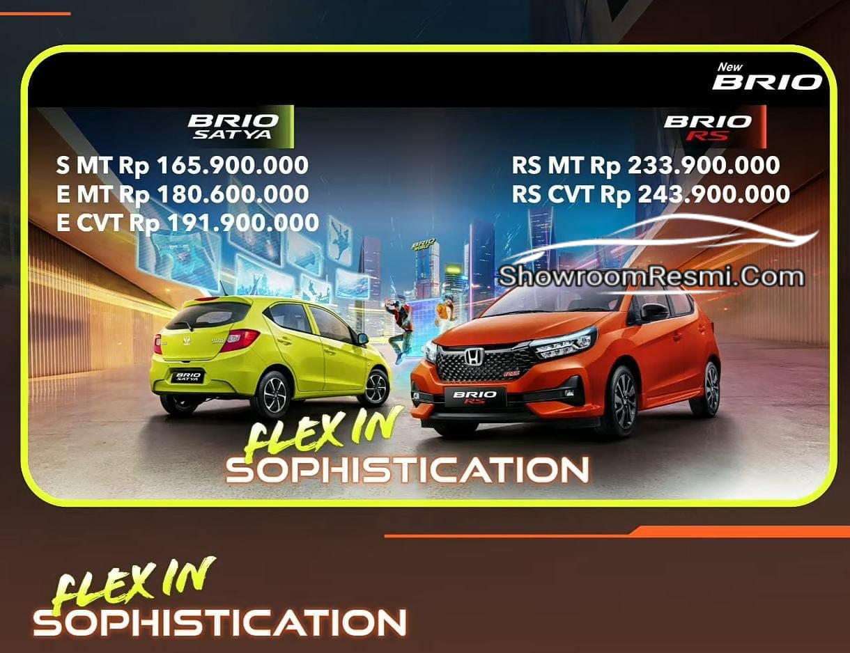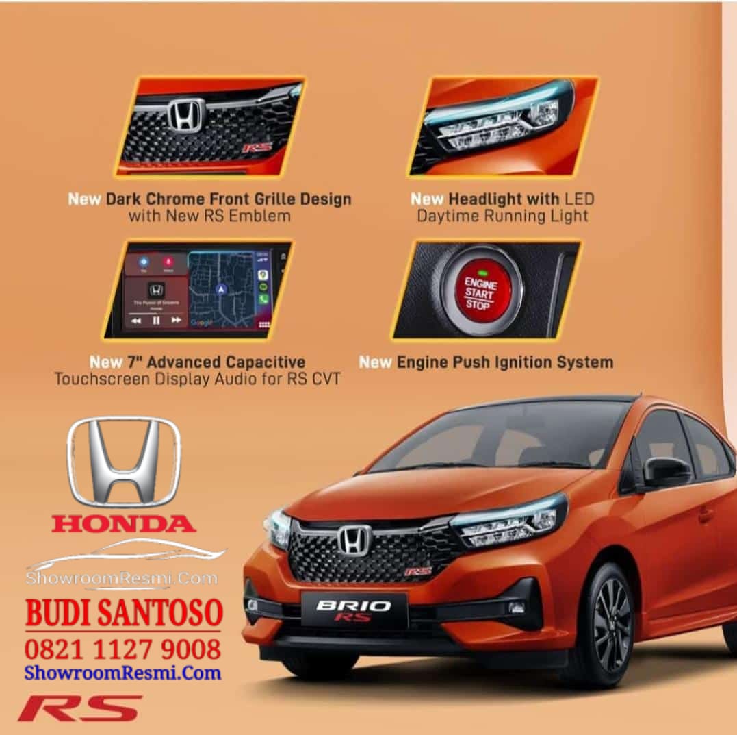 Feel the maximum power! Pacu adrenalin kamu dengan gaya sporty namun tetap stylish dengan All New Honda Brio! 1.2 Li-VTEC (90 PS). Rasakan tangguhnya performa mesin dengan tenaga terbesar dikelasnya, mampu menghasilkan akselerasi yang lebih responsif serta keseruan berkendara yang lebih optimal. CVT with Earth Dreams Technology. Pertama di kelas LCGC Indonesia! CVT with Earth Dreams Technology menjadikan perpindahan transmisi lebih halus, performa mesin lebih maksimal dan hemat bahan bakar. CVT Graphic Performance. Pertama di kelas LCGC Indonesia! CVT with Earth Dreams Technology menjadikan perpindahan transmisi lebih halus, performa mesin lebih maksimal dan hemat bahan bakar. EURO 4 Compliance. All New Honda Brio telah memenuhi standar emisi EURO 4 Compliance Electric Powersteering. Menambah kenyamanan dalam mengemudi saat berkendara. Sporty Tuned Suspension (RS). Rasakan sensasi berkendara sporty yang lebih nyaman dengan stabilitas ekstra berkat dukungan suspensi depan MacPherson Strut dan suspensi belakang H-Shape Torsion Beam yang telah disempurnakan.
