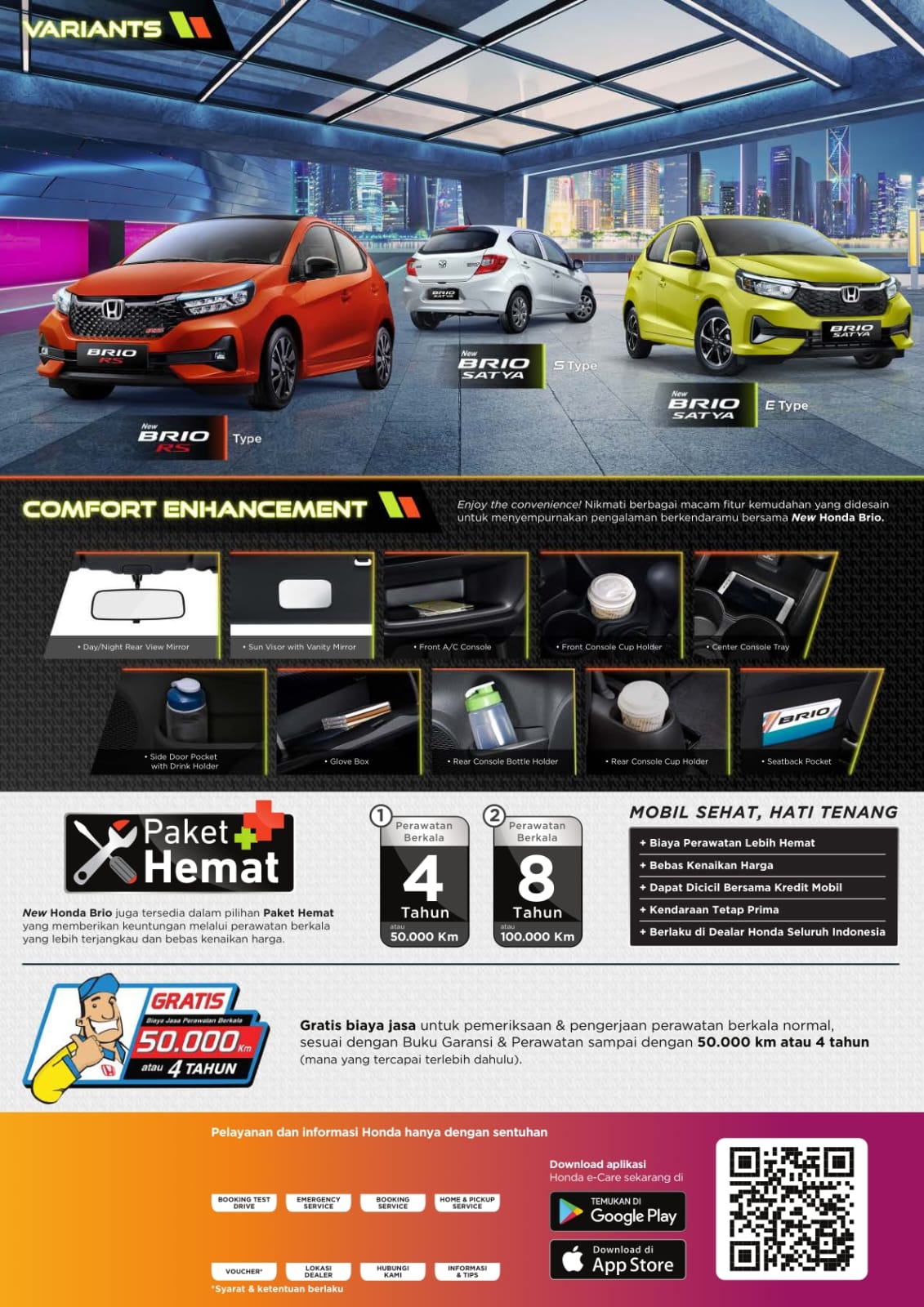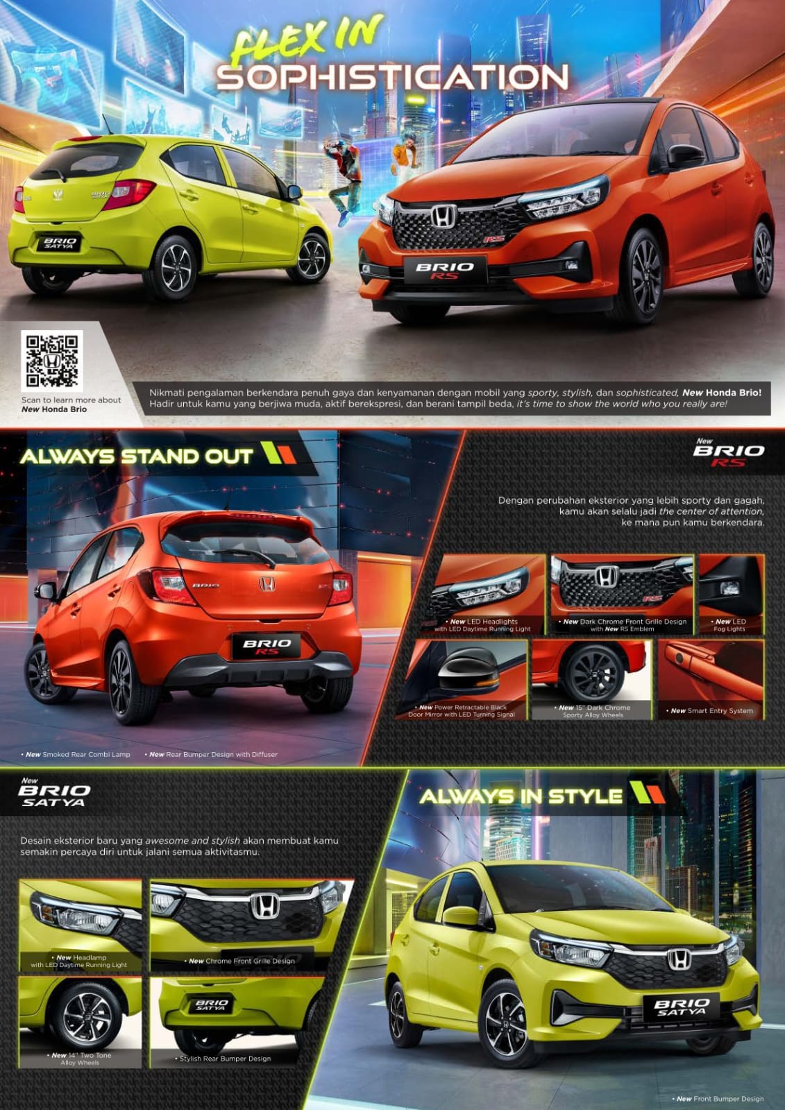 All New Honda Brio Satya sangat pas untuk kamu yang selalu tampil stylish dan All New Honda Brio RS cocok buat kamu yang berjiwa sporty. Whatever, whenever, however. Break out, break free with All New Honda Brio! FABULOUS DESIGN Start your fun with All New Honda Brio Satya! Pilihan trendy dan stylish untuk have fun bareng sama teman atau keluarga. All New Honda Brio RS untuk kamu yang suka dengan sensasi berkendara bergaya sporty dan lebih seru. Driving has never been this fun! AWESOME PERFORMANCE Feel the maximum power! Pacu adrenalin kamu dengan gaya sporty namun tetap stylish dengan All New Honda Brio! SAFETY PROTECTION Safety is our priority. Karena keselamatan adalah hal yang penting untuk kamu yang bergaya hidup sangat aktif. All New Honda Brio dilengkapi dengan fitur keselamatan yang baik sehingga memberikan rasa lebih aman dalam berkendara. DESIGN Start your fun with All New Honda Brio Satya! Pilihan trendy dan stylish untuk have fun bareng sama teman atau keluarga.