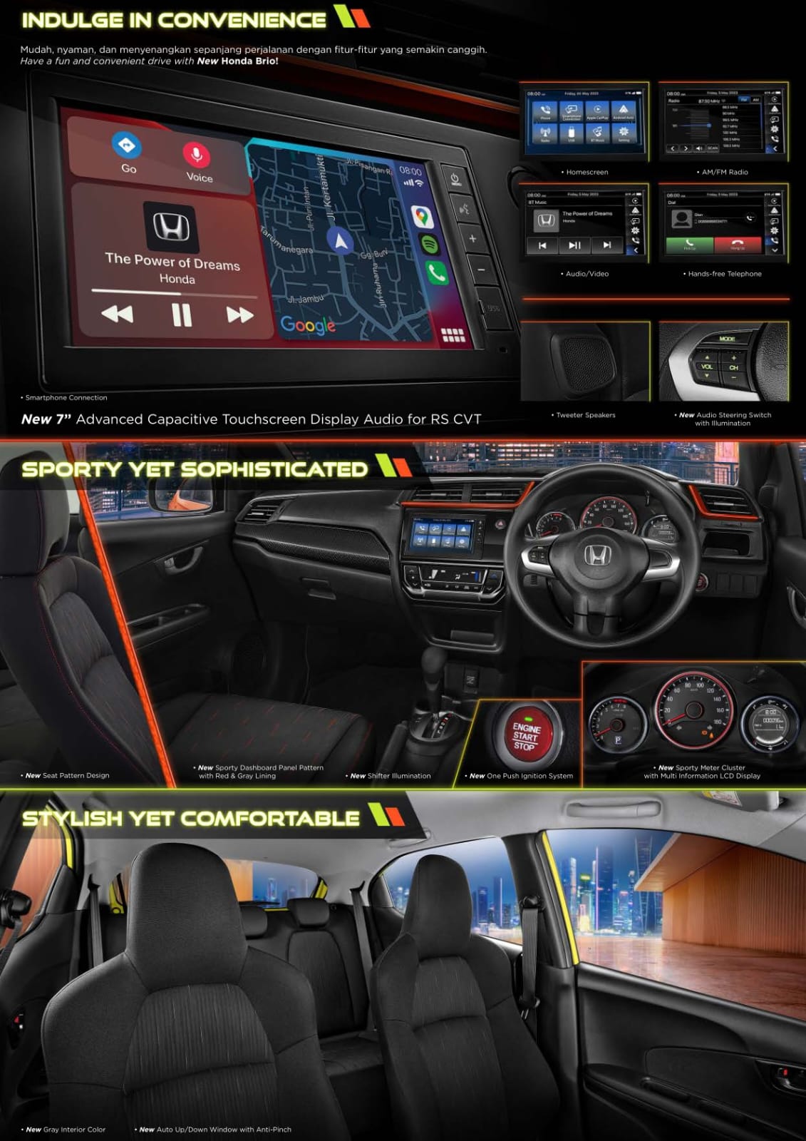 TECHNOLOGY Semakin menyenangkan selama perjalanan dengan fitur entertainment yang lebih seru. Feel the new excitement with All New Honda Brio! 6.1″ Touchscreen Display Audio with Bluetooth & HFT Function. Perjalanan kamu jadi semakin seru dengan display audio, yang memberikan kemudahan dalam memutar berbagai macam format musik favoritmu seperti AM/FM Radio, CD/DVD, iPod/iPhone, Bluetooth & USB Connection. Bahkan telah dilengkapi dengan fungsi Hands Free Telephone. Tweeter Speaker (RS). Nikmati kualitas audio yang lebih berkarakter dengan penambahan Tweeter Speakers. Audio Steering Switch. Memberikan kemudahan untuk mengatur audio langsung dari roda kemudi. Electric Trunk Opener. Membuka bagasi kini lebih mudah dengan tombol elektrik pada pintu bagasi. Bigger Dimension. Kini bepergian bersama teman atau keluarga lebih nyaman dan menyenangkan dengan kabin luas dari All New Honda Brio berkat dimensi yang lebih besar.