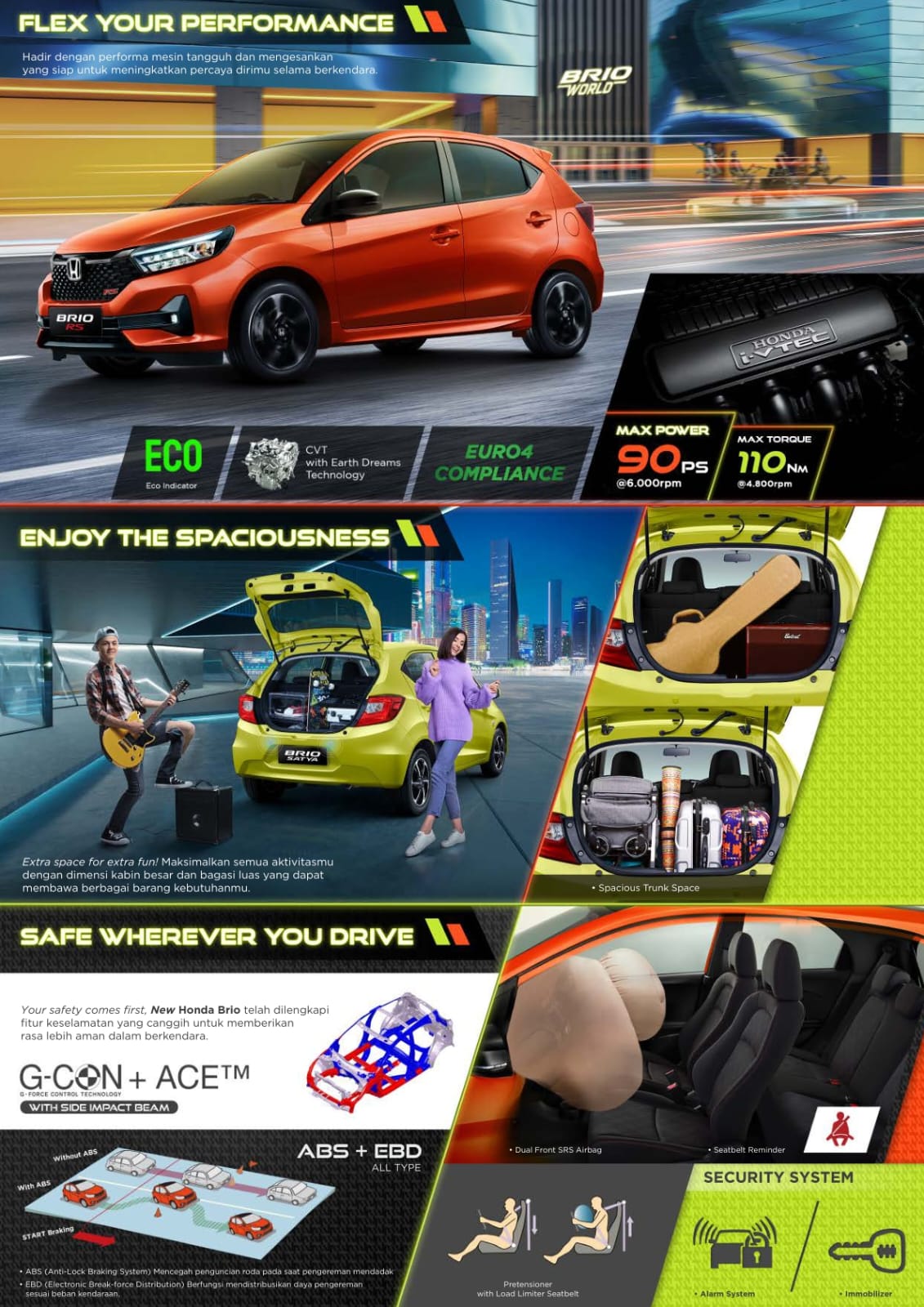 Safety is our priority. Karena keselamatan adalah hal yang penting untuk kamu yang bergaya hidup sangat aktif. All New Honda Brio dilengkapi dengan fitur keselamatan yang baik sehingga memberikan rasa lebih aman dalam berkendara. Struktur rangka mobil G-CON meredam dan menyalurkan energi benturan bila terjadi tabrakan yang tidak dapat dihindari, serta struktur canggih ACE™ yang melindungi kabin penumpang ketika bertabrakan dengan kendaraan yang berbeda ukuran dan Side Impact Beam yang meredam benturan saat terkena tabrakan dari samping. ABS + EBD ALL TYPE. ABS (Anti-Lock Braking System) Mencegah penguncian roda pada saat pengereman mendadak. EBD (Electronic Brake-force Distribution) Berfungsi mendistribusikan daya pengereman sesuai beban kendaraan. Pretensioner with Load Limiter Seatbelt. Ketika terjadi tabrakan, Pretensioner Seatbelt akan mengencang, sehingga tubuh tetap berada pada posisinya dan mencegah gerakan dada ke depan. Load Limiter berfungsi mengurangi tekanan yang berlebih dan mencegah cedera pada bagian dada serta memastikan posisi tubuh jatuh tepat pada airbag yang mengembang. Security System. Dual Front SRS Airbags & Seatbelt Reminder. Dual Front SRS Airbags tersedia di semua tipe All New Honda Brio. Seatbelt Reminder merupakan indikator yang memperingatkan pengemudi untuk menggunakan sabuk pengaman saat berkendara.
