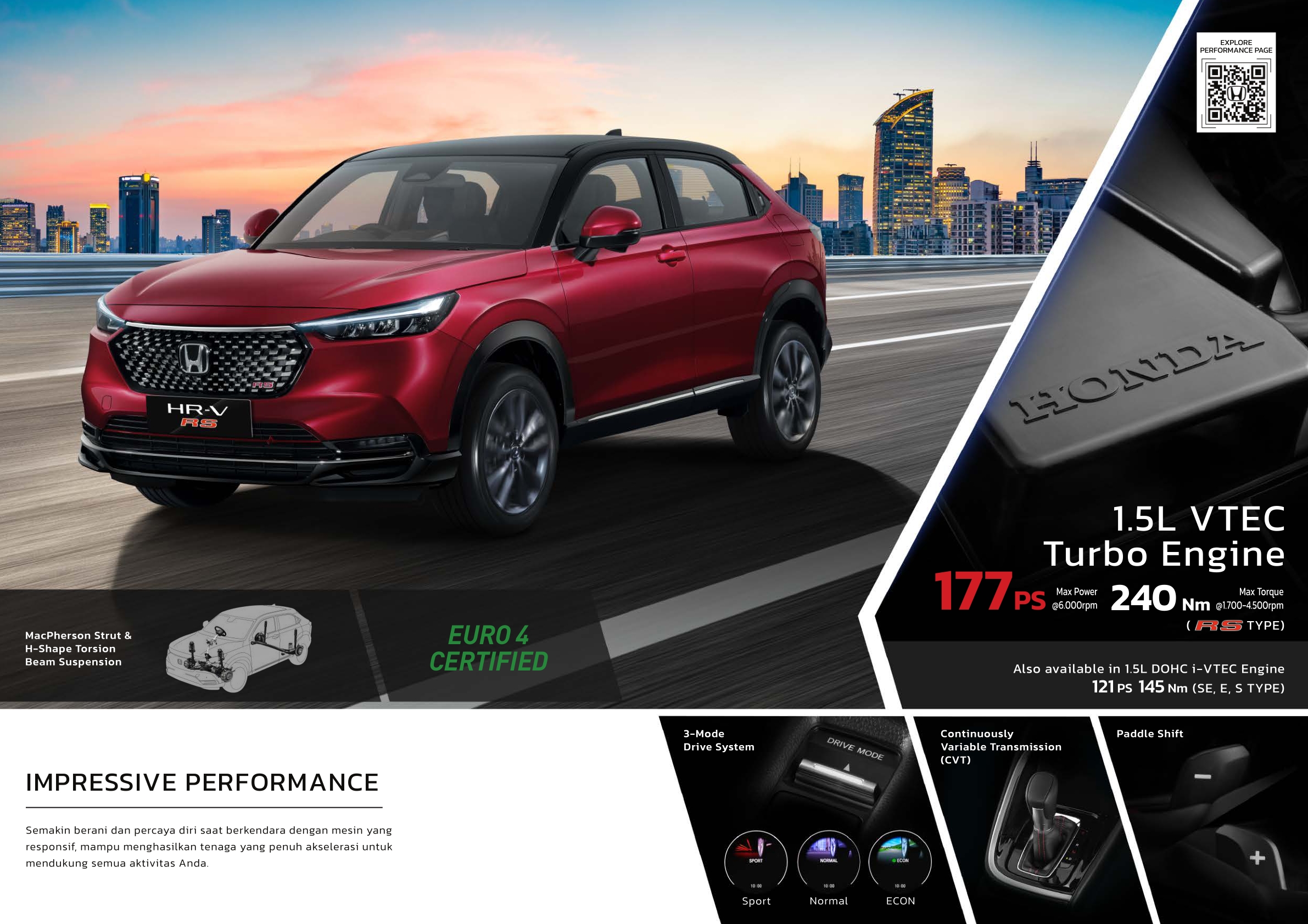 Semakin outstanding melibas tantangan di segala medan dengan performa memuaskan dari SUV terbaik di kelasnya. CVT with Earth Dreams Technology & 6 M /T CVT dengan Earth Dreams Technology untuk perpindahan transmisi yang lebih halus dan performa mesin yang maksimal serta konsumsi bahan bakar yang efisien. Juga hadir dalam pilihan 6 M/T untuk sensasi berkendara yang sporty. EURO-4 Compliance. New Honda HR-V telah memenuhi standar emisi EURO-4 Compliance. Paddle Shift MacPherson Strut & H-Shape Torsion Beam Suspension Eco Assist TM Memberikan petunjuk penghematan bahan bakar dengan menampilkan indikator warna yang berubah menjadi hijau, sebagai indikator konsumsi bahan bakar yang efisien. HR-V 1.8L PRESTIGE Untuk Anda pribadi berkelas yang menginginkan performa maksimal dengan fitur yang lebih lengkap New Honda HR-V hadir dengan Tipe 1.8L Prestige. Two – Tone Color Interior Chrome Exhaust Pipe Finisher New Projector Headlamp with LED Light Guide Semi Leather Seat Power Panoramic Sunroof • • • •