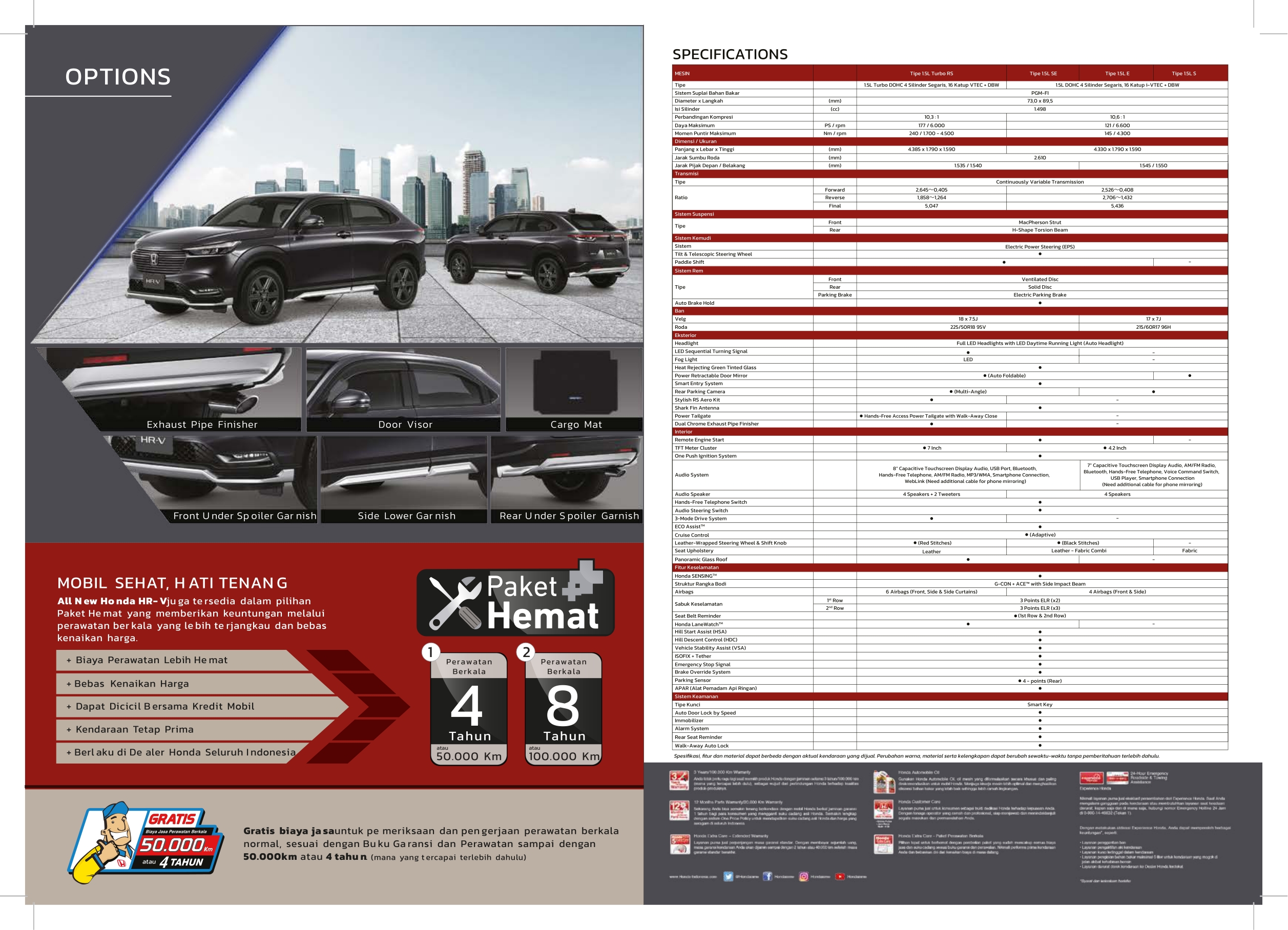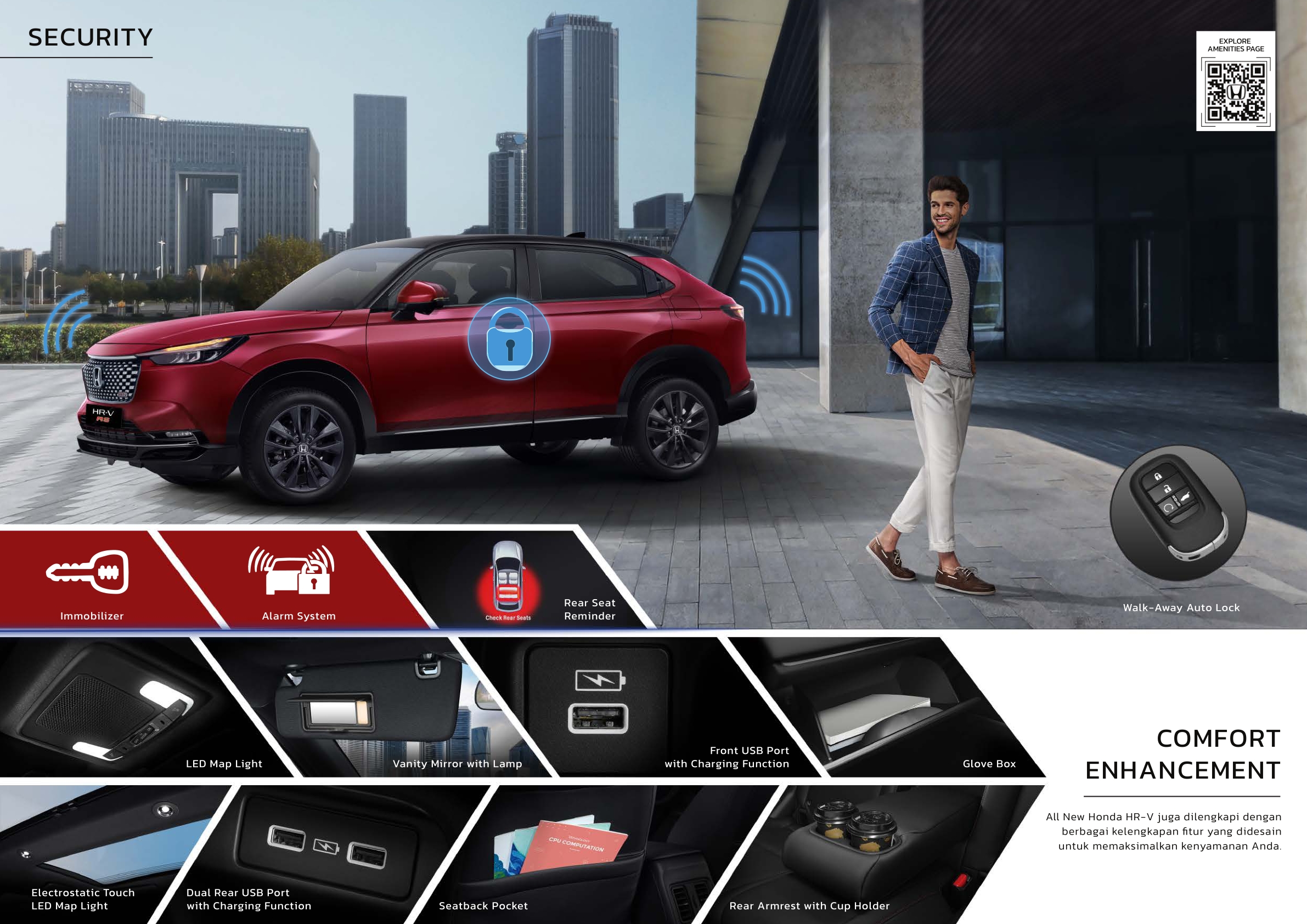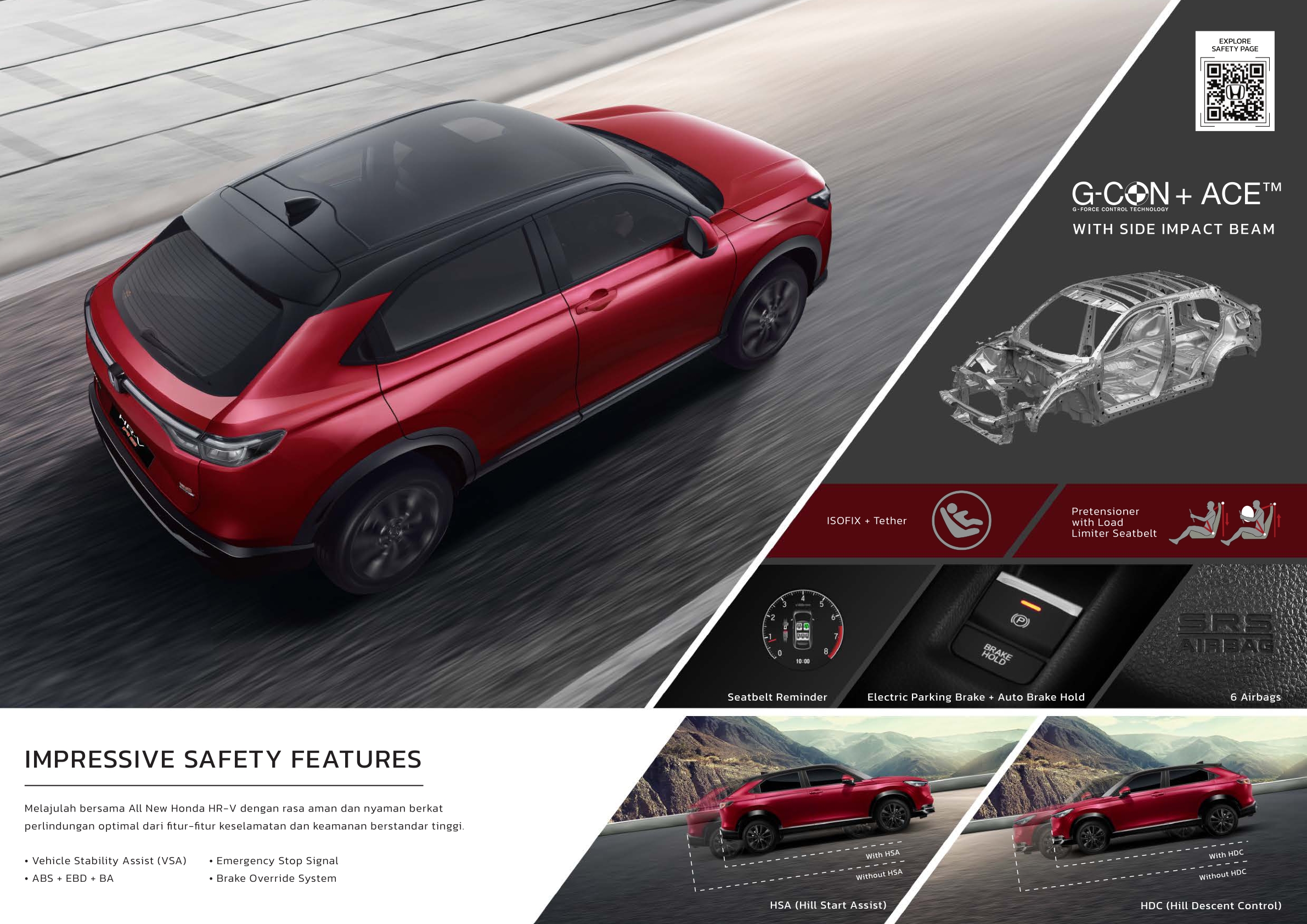 Keselamatan Anda adalah salah satu aspek penting bagi Honda. Honda HR-V hadir dengan fitur-fitur keselamatan tingkat tinggi untuk kenyamanan Anda di setiap perjalanan dan telah melalui uji tabrak menyeluruh di Honda Real World Crash Test Facility yang dilaksanakan di Tochigi, Jepang. 6 Airbags (available on Prestige). 6 Airbags (available on Prestige); Dual Front SRS Airbags Electric Parking Brake + Auto Brake Hold Electric Parking Brake membantu pengereman parkir hanya dengan satu sentuhan serta Auto Brake Hold dapat membantu menahan rem saat kondisi macet di tanjakan atau turunan. G-CON + ACETM with Side Impact Beam Struktur rangka dirancang untuk meredam dan menyalurkan benturan saat terjadi tabrakan • • • •