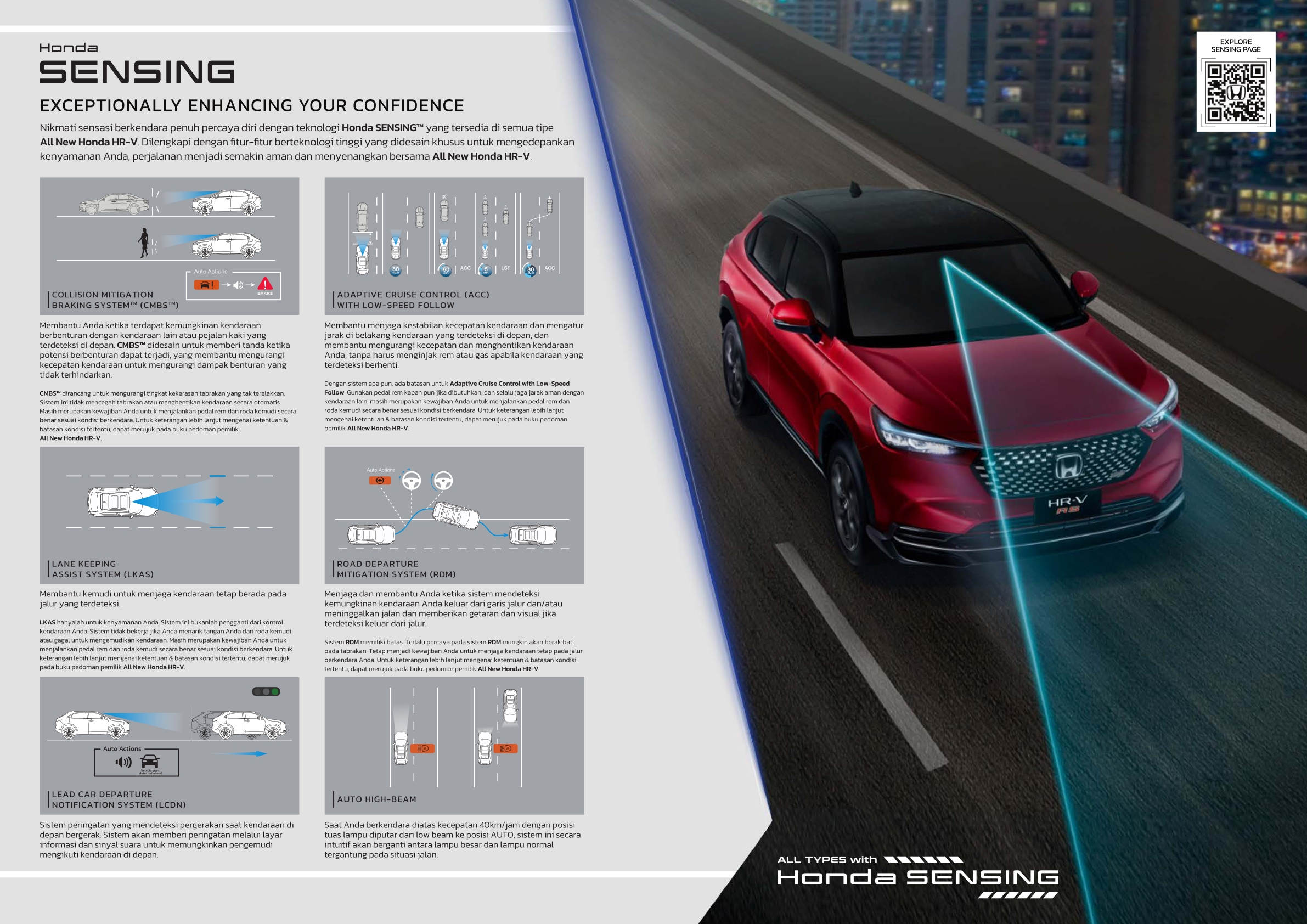 Motion Adaptive EPS + VSA Teknologi keselamatan terdepan yang menggabungkan teknologi VSA (Vehicle Stability Assist) untuk mengurangi gejala oversteer dan understeer saat bermanuver dan terintegrasi dengan EPS (Electronic Power Steering). VSA mengurangi gejala oversteering, EPS memberi bantuan tenaga ke arah berlawanan untuk mencegah pemutaran kemudi yang berlebihan. VSA mengurangi gejala understeering, EPS mencegah pemutaran roda kemudi yang berlebih sehingga mencegah slip pada roda depan. VSA memberikan pengereman pada keempat roda secara bergantian, EPS memberikan bantuan tenaga putar roda kemudi ke arah yang berlawanan saat terjadi gejala slip. EPS memberikan tenaga putar roda kemudi ke arah sebaliknya dari penyimpangan kendaraan. yang tidak dapat dihindari. Selain itu, kabin dirancang dengan struktur rangka terdepan sehingga memberikan perlindungan menyeluruh meskipun bertabrakan dengan kendaraan yang berbeda ukuran, serta Side Impact Beam yang meredam benturan saat terkena tabrakan dari samping. ASEAN NCAP Standar keselamatan Honda HR-V telah meraih predikat bintang 4 dan bintang 5 dari ASEAN New Car Assesment Program. Brake Override System Teknologi pengereman pintar yang mengutamakan fungsi pengereman apabila pedal gas dan rem terinjak secara bersamaan.