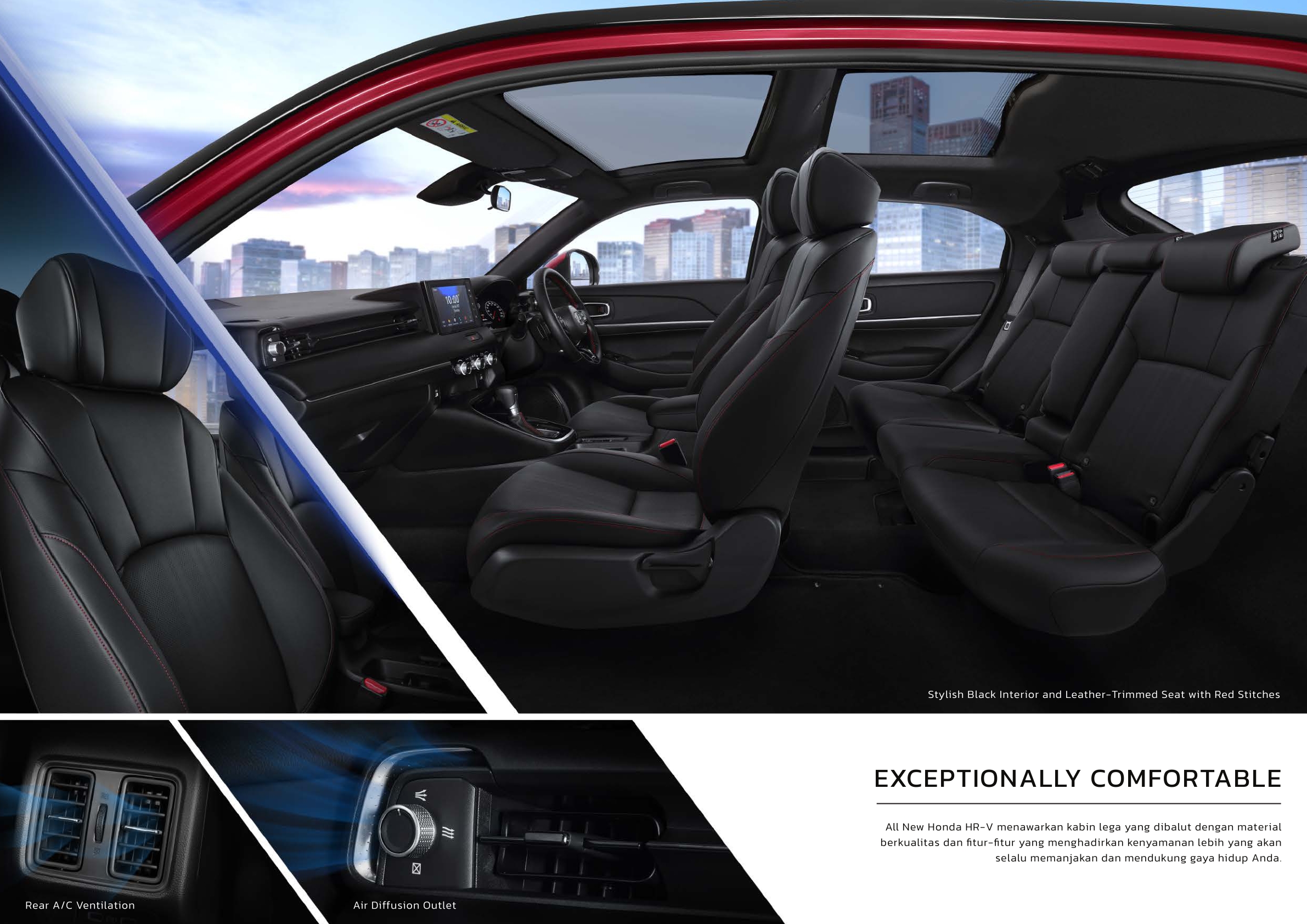 Interior New Honda HR-V yang dibalut dengan kombinasi material kulit di setiap detailnya semakin memperkuat kesan sporty dan mewah. Serta dilengkapi dengan fitur-fitur canggih yang memberikan kenyamanan berkendara yang eksklusif.