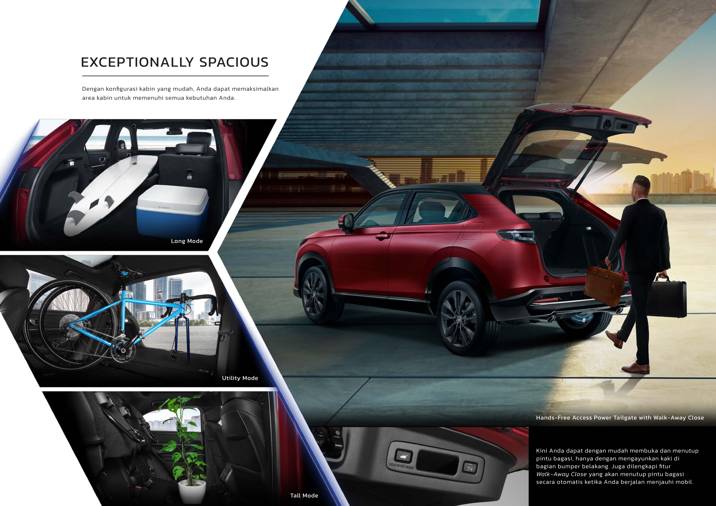Emergency Stop Signal Pada saat rem mendadak pada kecepatan tinggi, lampu hazard otomatis berkedip untuk memperingatkan kendaraan di belakang. Hill Start Assist Memberikan kemudahan akselerasi saat kondisi stop and go pada kondisi jalan menanjak. ABS+EBD+BA Semua tipe New Honda HR-V sudah dilengkapi dengan teknologi pengereman ABS+EBD+BA Alarm System Immobilizer Smart Key (Tipe 1.5 E & 1.8L Prestige) Wave Key + Keyless Entry (Tipe 1.5 S) DESIGN Honda HR-V kini tampil dengan tampak depan baru yang lebih stand out, kental dengan aura maskulin yang sporty dan elegan. Karakter SUV premium yang tangguh terpancar dari garis-garis otot bodinya yang aerodinamis, mempertegas kesan outstanding dari segala sisi. Stand Out Design (Front & Side) Stand Out Design (Rear) Stand Out Design (Front) Stand Out Inside Berpetualang dengan penuh kenyamanan sepanjang perjalanan dalam ruang kabin New Honda HR-V yang fleksibel dan luas. NEW Front Seat Design NEW Sporty Pedal Pad High Deck Console with Arm Rest Driver Seat Height Adjuster Spacious Trunk Space Ke manapun Anda pergi, apapun barang Anda, bagasi berkapasitas besar siap menampung barang bawaan Anda ke mana saja. Long Mode Tall Mode Utility Mode